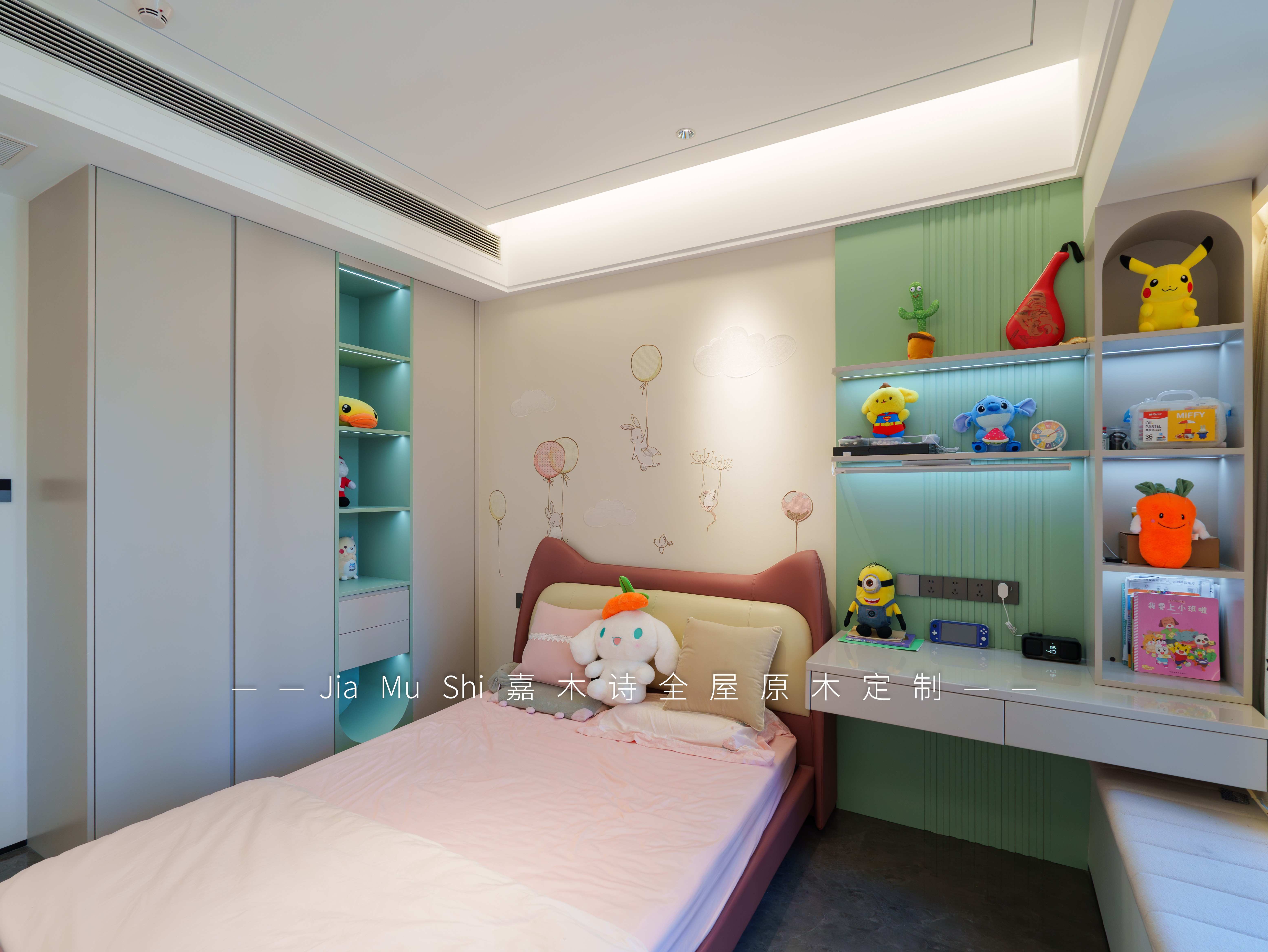 风格属于现代简约风,为了让儿童房整体看上去温馨,采用双色设计,并且增加了开放格让空间更加灵动,实木护墙板更是让空间色彩更加和谐。